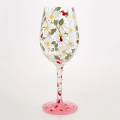 花々の間にいる愛らしいてんとう虫で飾られたワイングラスです。