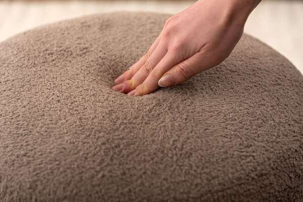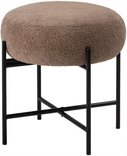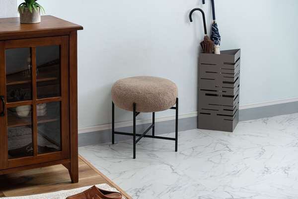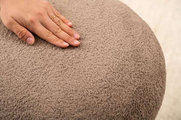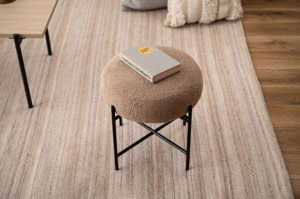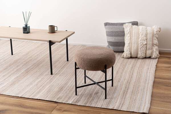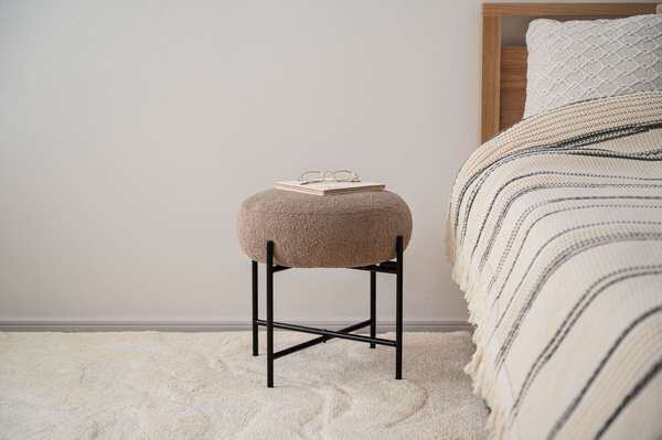 マットな質感のブラックスチールと、落ち着いた色味の生地が織りなすコントラストが目を引くスツール。立体感がありやさしい丸みを帯びた座面が、空間に優しい雰囲気を与えます。