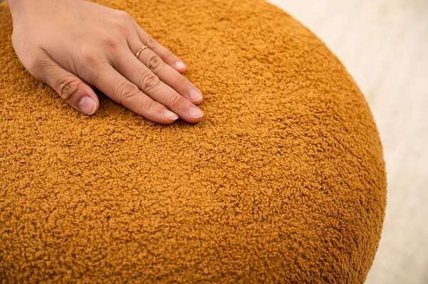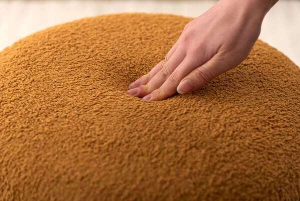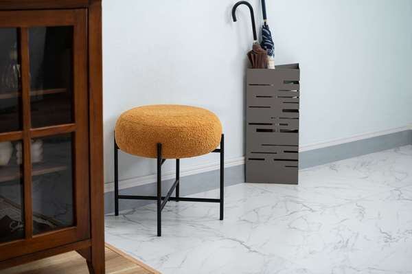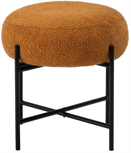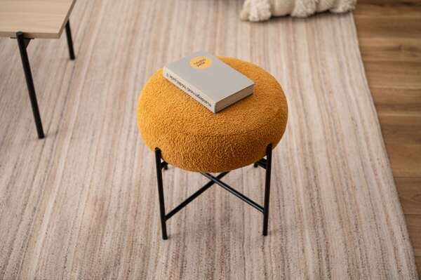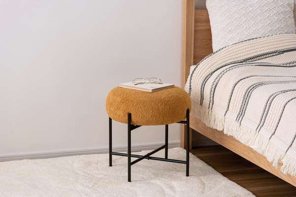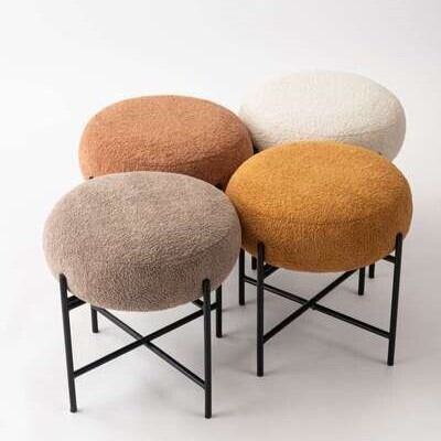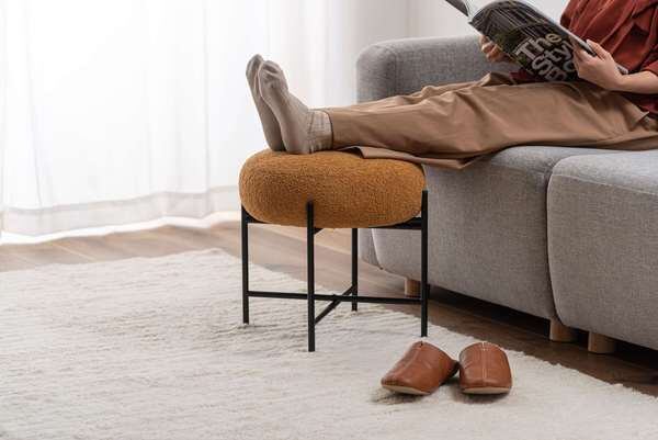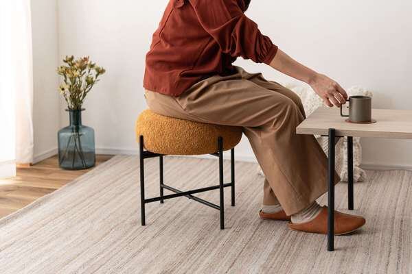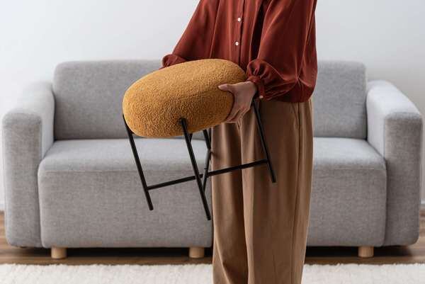 マットな質感のブラックスチールと、落ち着いた色味の生地が織りなすコントラストが目を引くスツール。立体感がありやさしい丸みを帯びた座面が、空間に優しい雰囲気を与えます。